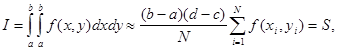 где xi, yi - случайные числа, равномерно распределенные на интервалах [a, b] и [c, d] соответственно. Оценка точности вычисления интеграла по формуле (b) совершенно аналогично приведенной выше для случая однократного интеграла и поэтому здесь не приводится.
