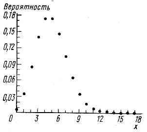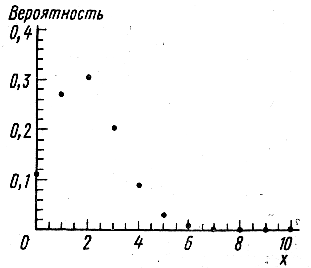 На рис. 5 случайная величина, распределенная по закону Пуассона, представлена в графической форме. Случайная величина, распределенная по закону Пуассона, служит моделью эксперимента, связанного с определением численности бактерий в единице объема, или численности животных на единицу площади, и других подобных экспериментов.