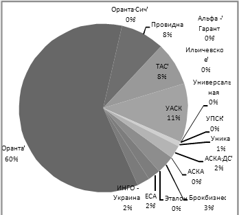 Загальна страхова сума склала 268 мільйонів гривень, а сума зібраних премій - 14,4 мільйонів гривень. Частка страхових компаній у загальній сумі зібраних премій за договорами страхування озимих культур у сезоні 2009-2010 років показана на графіку 2.
