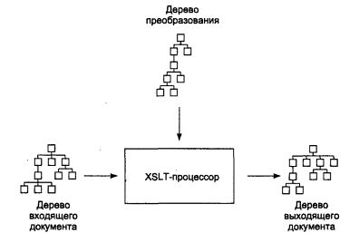 Процессор получает входящий документ и преобразование, и, применяя правила преобразования, генерирует выходящий документ – такова в общем внешняя схема картины. На самом деле процессор оперирует не самими документами, а древовидными моделями их структур – именно структурными преобразованиями занимается XSLT, оставляя за кадром синтаксис, который эти структуры выражает.