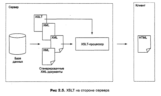 На этой схеме нет четкой границы, которая отделяла бы клиент от сервера. Дело в том, что существует два принципиально различных способа использования XSLT в подобной архитектуре: преобразования могут выполняться как на стороне сервера, так и на стороне клиента.