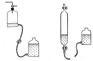 Аспиратор — это прибор, состоящий из двух склянок с боковыми тубусами. Тубусы соединены между собой резиновым шлангом в середине которого имеется винтовой зажим. Одна из склянок снабжена стеклянным краном и служит для забора газа. Другая является напорной уравнительной склянкой. Так как многие газы растворимы в воде, то в качестве напорной жидкости применяют насыщенный раствор поваренной соли, подкисленный соляной кислотой, или 10%-йый раствор серной кислоты, который подкрашивают метиловым оранжевым.