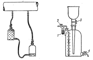 Из емкостей и газопроводов пробу газа отбирают в большинстве случаев в аспираторы (рис. 1) и газовые пипетки (рис. 2).