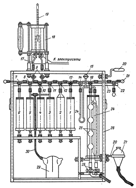 Двойная-газовая бюретка 25, помещенная в водяную рубашку, с уравнительной склянкой 27. Бюретка состоит из двух соединенных между собой частей. Обе части снабжены стеклянной вилкой 28 с двумя прямыми кранами. Такая конструкция допускает либо совместное, либо раздельное использование обеих частей. Общий объем бюретки 102 мл. Левая часть имеет по длине четыре расширения, вместимостью по 20 мл каждое. На сужениях (между расширениями) нанесены деления, позволяющие производить отсчет объемов в 20, 40, 60 и 80 мл с точностью до 0,05 мл. Правая часть бюретки — трубка вместимостью 22 мл — градуирована по всей длине на 0,05 мл.