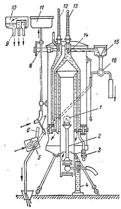 1—камера горения; газовая горелка; 3—спускной кран; мерный цилиндр; 5—шибер; б—выхлопная труба; 7, 12 и 13—термометры; 8 — штуцер; 9 — стеклянная трубка; 10—переливная воронка; 11 —приемник для воды; 14—устройство для перемешивания; 15—воронка.