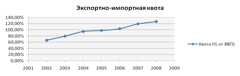 Объем внешней торговли составляет 87% ВВП в 2008 г. Эта цифра сильно изменилась с 2002 г. Если в 2002 г. объем внешней торговли составлял 71% ВВП, то в 2006 г. эта цифра уже была равна 83% ВВП. Это связано с изменением обменного курса, т.к. сравнение производится в долларах США.