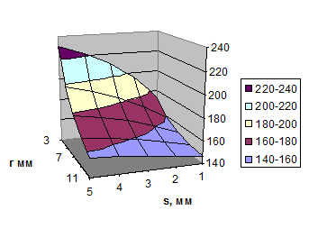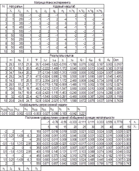 101. Проанализируйте по полученной диаграмме области возможных режимов обработки материала, памятуя, что допустимый уровень функции желательности D=0,368
