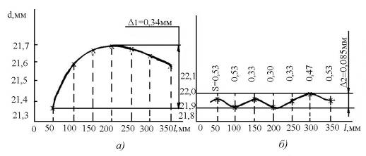 Рис. 3. Зміна діаметра dвалика по довжині в результаті обточування з частотою обертання n= 375 об/хв із припуском Z= 2 мм на діаметрі: а – з постійною подачею (S=0,3мм/об); б – зі змінною подачею