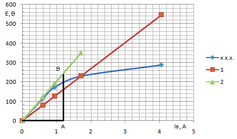 ЭДС генератора при номинальной частоте вращения соответствует значению ЭДС в точке пересечения характеристики холостого хода и характеристики цепи возбуждения (рис. 2.):