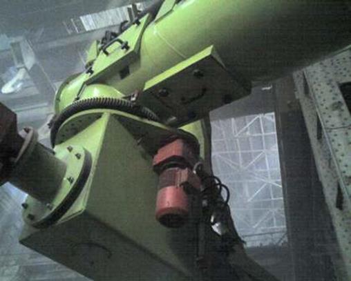 Далее контакт подаёт сигнал на пускатель, который включает привод манипулятора-перестановщика, который подъезжает к платформе и начинает свою работу: происходит опускание захватов, захват отливки, подъём отливки и