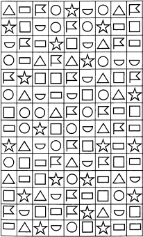 Выявляется способность к переключению и распределению внимания; выполняется в течение 2-х минут. Оценка качества, учитывающая количество просмотренных ребенком знаков и сделанных ошибок, выражается в стандартных единицах(20). |