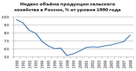 В 2008 году объём выпуска сельского хозяйства России составил 87% от уровня 1990 года, растениеводства – примерно 130%, животноводства – примерно 60%.