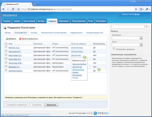 Один і той же користувач може бути виконавцем на одному сервісі і замовником на іншому. Наприклад, співробітник help desk є виконавцем на сервісі "Підтримка бухгалтерії", і в той же час замовником на сервісі "Замовлення канцелярії". Чи являється користувач виконавцем визначається роллю, з якою він призначений на сервіс (2).
