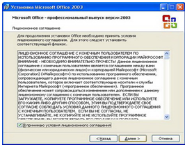 Первый экран Помощника установки Microsoft Office 2003 предлагает нам ввести лицензионный серийный номер, который указан на коробке с программой. Введите его в предложенные формы и жмите Далее.