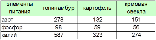 Многолетними опытами и производственной проверкой практически во всех регионах России доказано, что внесение органических удобрений (навоза, торфонавозных компостов) с необходимой дозой минеральных (NPK-азот, фосфор, калий) обеспечивает удвоенный и более урожай зеленой массы и клубней топинамбура. Внесение минеральных удобрений увеличивает также выход сухих веществ, сахара и протеина (таблица 3