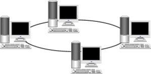 Топологія «Кільце» активна топологія. Всі комп'ютери в мережі зв'язані по замкнутому колу (див. рис. 2.3). Прокладка кабелів між робочими станціями може виявитися досить складною і дорогою, якщо вони розташовані не по кільцю, а, наприклад, в лінію. В якості носія в мережі використовується «вита пара» або оптоволокно. Повідомлення циркулюють по колу. Робоча станція може передавати інформацію другий робочої станції тільки після того, як отримає право на передачу (маркер), тому колізії виключені. Інформація передається по кільцю від однієї робочої станції до іншої, тому при виході з ладу одного комп'ютера, якщо не брати спеціальних заходів вийде з ладу вся мережа.