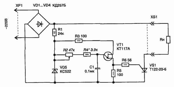 позволяет плавно менять (переменным резистором R2) температуру нагревателя в широких пределах. Устройство имеет бестрансформаторное питание и малые габариты, что позволяет разместить его в подставке под паяльник. Схема не критична к типам деталей, и ее настройка заключается в подборе номинала резистора R4 (при нулевом значении R2) для получения максимального напряжения на нагревателе. Подключаемый паяльник может иметь мощность от 15 до 300 Вт, а при замене диодов VD1 ...VD4 на больший ток — до 1000 Вт.
