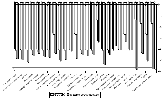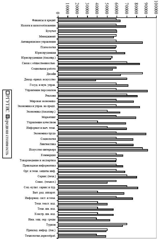 По специальностям, по которым ведется обучение РГУТиС, но не ведется обучение вузами, образующими конкурентную среду, проводился выборочный анализ в сравнении с государственными вузами, находящимися в других округах г. Москвы и имеющими рейтинг, близкий к рейтингу РГУТиС (по обобщенным данным независимого рейтингования).
