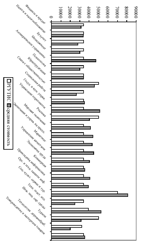 По 27% специальностей заочной формы стоимость обучения выше средней по конкурентной среде (отклонение более 10%). К таким специальностям относятся: 080109 Бухучет, анализ и аудит, 100201 Туризм, 030301 Психология, 040101 Социальная работа, 032401 Реклама, 260704 Технология текстильных изделий, 250403 Технология деревообработки. По 27% специальностей стоимость обучения близка к среднему значению (отклонение не превышает 10%): 080107 Налоги и налогообложение, 030501 Юриспруденция, 030603 Связи с общественностью, 080504 Государственное и муниципальное управление, 080301.20 Коммерция (торговое дело), 080401 Товароведение и экспертиза товаров. По 46% специальностей стоимость обучения ниже среднего значения (отклонение более 10%). Наибольшее отрицательное отклонение (больше 30%) наблюдается по специальностям: 080503 Антикризисное управление, 080505 Управление персоналом, 220501 Управление качеством. Соотношение стоимости обучения по заочной и очной форме практически по всем специальностям не соответствует среднему значению (кроме таких специальностей, как 090103 Организация и технология защиты информации, 230201 Информационные системы и технологии) (рис. 4). Стоимость по заочной форме в среднем по конкурентной среде значительно ниже стоимости по очной форме, чем наблюдается по РГУТиС. Наибольшее несоответствие наблюдается по специальностям: 030603 Связи с общественностью, 032401 Реклама, 220501 Управление качеством, 260704 Технология текстильных изделий, 280202.00 Инженерная защита окружающей среды, 100201 Туризм, 250403 Технология деревообработки.