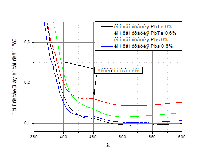 При изменении концентрации PbS и PbTe в стекле так же, как и в растворе, наблюдается смещение края полосы поглощения, что объясняется изменением ширины запрещенной зоны полупроводниковых частиц с изменением их размера (рис.2).