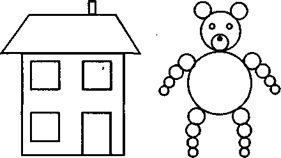 – Форма предметів складається з кількох геометричних фігур. Виділяючи їх, знаючи послідовність поєднання, можна намалювати будь-який предмет. Намалюйте сьогодні кілька таких предметів, використовуючи геометричні фігури. Користуйтеся лінійкою з отворами, фломастерами, різнокольоровими ручками чи олівцями.
