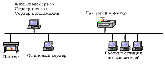 Главной целью сети отдела является разделение локальных ресурсов, таких как приложения, данные, лазерные принтеры и модемы. Обычно сети отделов имеют один или два файловых сервера и не более тридцати пользователей (рис. 1). Сети отделов обычно не разделяются на подсети. В этих сетях локализуется большая часть трафика предприятия. Сети отделов обычно создаются на основе какой-либо одной сетевой технологии - Ethernet.
