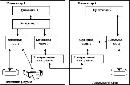 На рисунке 1.2 показано взаимодействие сетевых компонентов. Здесь компьютер 1 выполняет роль "чистого" клиента, а компьютер 2 - роль "чистого" сервера, соответственно на первой машине отсутствует серверная часть, а на второй - клиентская. На рисунке отдельно показан компонент клиентской части - редиректор. Именно редиректор перехватывает все запросы, поступающие от приложений, и анализирует их. Если выдан запрос к ресурсу данного компьютера, то он переадресовывается соответствующей подсистеме локальной ОС, если же это запрос к удаленному ресурсу, то он переправляется в сеть. При этом клиентская часть преобразует запрос из локальной формы в сетевой формат и передает его транспортной подсистеме, которая отвечает за доставку сообщений указанному серверу. Серверная часть операционной системы компьютера 2 принимает запрос, преобразует его и передает для выполнения своей локальной ОС. После того, как результат получен, сервер обращается к транспортной подсистеме и направляет ответ клиенту, выдавшему запрос. Клиентская часть преобразует результат в соответствующий формат и адресует его тому приложению, которое выдало запрос.
