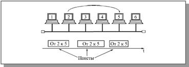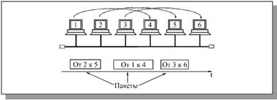 В частном случае (рис. 1) все эти пакеты могут передаваться одним абонентом (когда другие абоненты не хотят передавать). Но обычно в сети чередуются пакеты, посланные разными абонентами (рис 2).