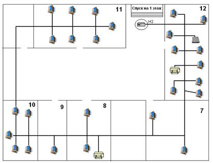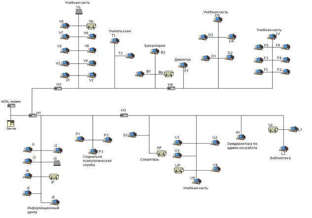 В итоге выполнения проекта была спроектирована сеть по технологии FastEthernet, с топологией звезда, объединяющая 5 сегментов проводной сети (беспроводных сегментов нет), с выделенным файловым сервером и подключением к Интернет по технологии ADSL (100 Мбит/сек).