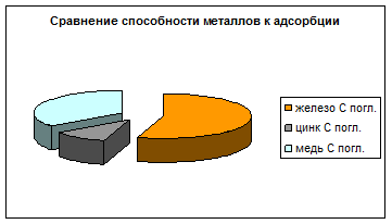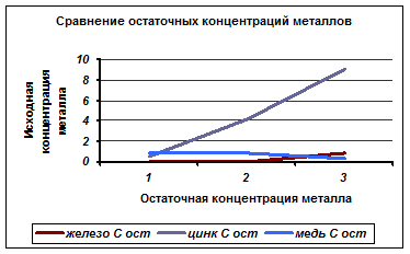По результатам эксперимента четко видна зависимость способности к адсорбции от типа металла. Из рис. 8 следует, что железо адсорбируется лучше меди, а медь в свою очередь обладает большим адсорбционным сродством, чем цинк. Полученные данные хорошо согласуются со многими литературными источниками.