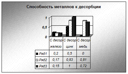 Очень важно при обсуждении результатов учесть процесс десорбции, т.к. от него зависит эффективность или не эффективность проделанной работы. Сравнение концентрации десорбированного металла изображено на рис. 6. Из него видно, что минимальное сродство к десорбции у железа и наибольшее у цинка.