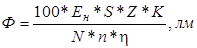 - коэффициент использования светового потока лампы, %, зависящий от типа лампы, типа светильника, коэффициента отражения потолка и стен, высоты подвеса светильника и индекса помещения