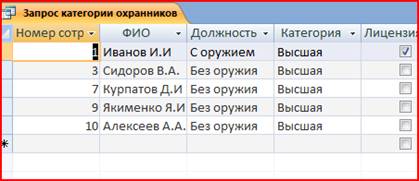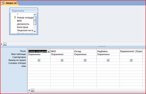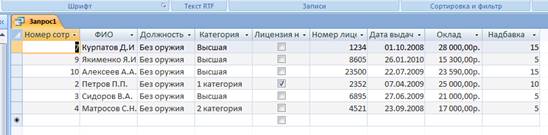 - «Охранники», которая содержит информацию о сотрудниках фирмы, их категории, заработной плате, лицензии на оружие, номере лицензии, дате её выдачи. Структура таблицы «Охранники» представлена в Таблице 1.