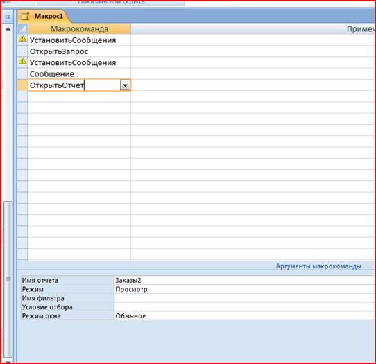 Макрокоманда позволяет открыть отчет в режиме конструктора или режиме предварительного просмотра, а также вывести отчет на печать. Кроме того, можно ограничить записи, которые будут печататься в отчете. |