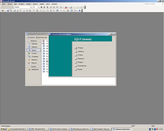изучение технологии разработки простых и составных форм для ввода, редактирования и просмотра данных, хранимых в таблицах; освоение возможностей редактирования форм (изменение формата выводимых данных, создание надписей, кнопок, переключателей, списков и т.д.); освоение технологий создания процедур на языке Visual Basic по контролю вводимых данных;