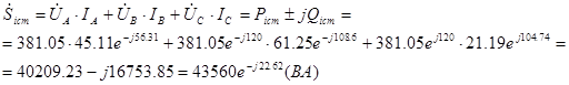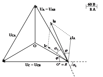 Кут φ зберіг своє значення в цих фазах. Споживана потужність знайдеться як сума потужностей фаз А та В: