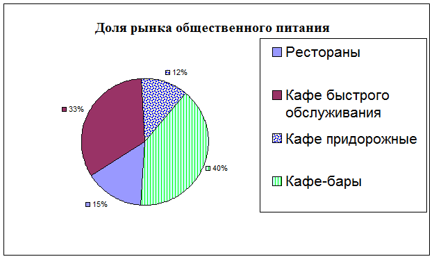 В настоящее время на территории г. Санкт-Петербург существует большое количество закусочных, ресторанов, кафе и придорожных кафе. Но пунктов качественного питания мало. По результатам опроса, посетителей не устраивают или высокие цены, или некачественная еда. Анализ рынка показал - доля кафе быстрого обслуживания составляет 33%, что можно увидеть на (Рис. 1). При этом емкость рынка общественного питания еще не исчерпана, и ее запас составляет около 15%. Эти данные мотивированы тем, что в некоторых районах места общественного питания просто отсутствуют, спальные районы, новостройки.