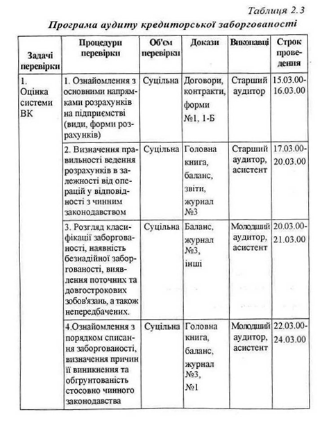Прикладом програми аудиту може бути перевірка кредиторської заборгованості.