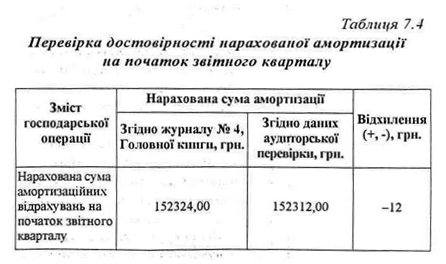 Нарахування амортизаційних відрахувань перевіряється аудитором шляхом прямого розрахунку за квартал, у якому за даними Головної книги розмір нарахованої суми амортизації значно більший від інших кварталів. У випадку виявлення помилок у розрахунках сум амортизаційних відрахувань необхідно перевірити й інші квартали та визначити вплив виявлених помилок на собівартість продукції. Визначені суми амортизаційних відрахувань порівнюються з фактичними сумами, наведеними у відомості розрахунку амортизації основних засобів. Достовірність розрахунків амортизаційних відрахувань перевіряється порівнянням їх з даними регістрів синтетичного й аналітичного обліку (журнал № 4, Головна книга) з інвентарними картками, що засвідчує робочий документ аудитора (табл. 7.4).