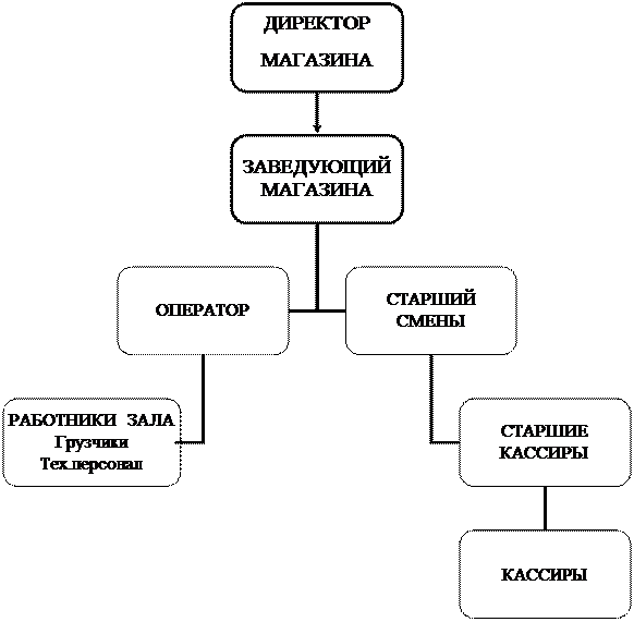 В магазине МАГАЗИН осуществляется только розничная торговля. В этом магазине используется метод самообслуживания, поэтому, как уже не раз отмечалось, в данном случае складское помещение не рассматривается отдельно как склад, а лишь в комплексе с торговым залом магазина. Поэтому все трудовые процессы выполняемые работниками торговых организаций взаимосвязаны. Организационная структура магазина МАГАЗИН представлена на рисунке.