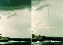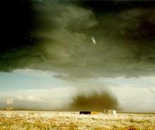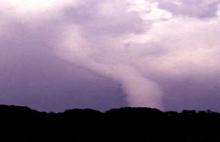 Смерч (синонимы – торнадо, тромб, мезо-ураган) – это очень сильный вращающийся вихрь с размерами по горизонтали менее 50 км и по вертикали менее 10 км, обладающий ураганными скоростями ветра более 33 м/с. Энергия типичного смерча радиусом 1 км и средней скоростью 70 м/с, по оценкам С.А.Арсеньева, А.Ю.Губаря и В.Н.Николаевского, равна энергии эталонной атомной бомбы в 20 килотонн тротила, подобной первой атомной бомбе, взорванной США во время испытаний «Тринити» в Нью-Мексико 16 июля 1945. Форма смерчей может быть многообразной – колонна, конус, бокал, бочка, бичеподобная веревка, песочные часы, рога «дьявола» и т.п., но чаще всего смерчи имеют форму вращающегося хобота, трубы или воронки, свисающей из материнского облака (отсюда и их названия: tromb- по французски труба и tornado – по испански вращающийся). Ниже на фотографиях показаны три смерча в США: в форме хобота, колонны и столба в момент касания ими поверхности земли, покрытой травой (вторичное облако в виде каскада пыли вблизи поверхности земли не образуется). Вращение в смерчах происходит против часовой стрелки, как и в циклонах северного полушария Земли.