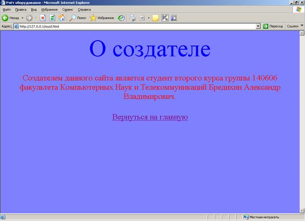 <h3>Создателем данного сайта является студент второго курса группы 140606 факультета Компьютерных Наук и Телекоммуникаций Бредихин Александр Владимирович.</h3><br>