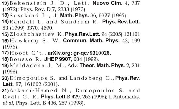 дополнительных компактных измерений она модифицируется в при , где — максимальный размер этих измерении. Тогда с уменьшением растет гораздо быстрее, чем по закону обратных квадратов, и уже на расстояниях порядка сантиметров компенсирует силу электростатического отталкивания. А ведь именно она была причиной высокой пороговой энергии: чтобы преодолеть кулоновские силы и приблизить сталкивающиеся частицы на необходимое расстояние , приходилось сообщать частицам пучка большую кинетическую энергию. В случае же существования дополнительных измерений ускоренный рост экономит значительную часть необходимой энергии. Все вышесказанное никоим образом не означает, что мини-дыры будут получены уже на мощностях LHC — это произойдет лишь при самом благоприятном варианте теории, которую «выберет» Природа. Кстати, не следует преувеличивать их опасность в случае получения[5]