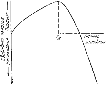 Переход из жидкого состояния в кристаллическое требует затраты энергии на образование поверхности раздела жидкость – кристалл. Процесс кристаллизации будет осуществляться, когда выигрыш от перехода в твердое состояние больше потери энергии на образование поверхности раздела. Зависимость энергии системы от размера зародыша твердой фазы представлена на рис. 3.3.