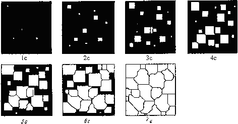 Центры кристаллизации образуются в исходной фазе независимо друг от друга в случайных местах. Сначала кристаллы имеют правильную форму, но по мере столкновения и срастания с другими кристаллами форма нарушается. Рост продолжается в направлениях, где есть свободный доступ питающей среды. После окончания кристаллизации имеем поликристаллическое тело.