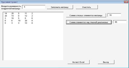 Согласно заданию был разработан программный модуль, осуществляющий заполнение матрицы А(n,n), которую задает пользователь, чтение заданной матрицы с листа Excel и подсчета суммы угловых элементов и элементов над верхней диагональю. При тестировании программ никаких отклонений не обнаружено: каждая функция корректно выполняет все операции. Таким образом, можно сделать вывод о том, что поставленная задача выполнена: на языке программирования Visual Basic for Application созданы программы, с помощью которых можно заполнить случайными числами квадратную матрицу размером n x n, найти сумму ее диагональных элементов и элементов над главной диагональю. В программе предусмотрена обработка ошибок, что обеспечивает бесперебойную работу программы.