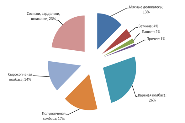 Таким образом, более половины общих продаж российского рынка мясной гастрономии приходилось на различные виды колбас. Второе по объемам продаж занимают сосиски, сардельки и шпикачки. Что касается рынка изделий мясной гастрономии, то уровень достатка населения страны не позволяет покупать продукты в том объеме, в котором возникает желание. В связи с этим рынок еще недостаточно насыщен, есть потенциал роста. В полной степени развит рынок дешевых и отчасти средних по цене колбасных изделий.
