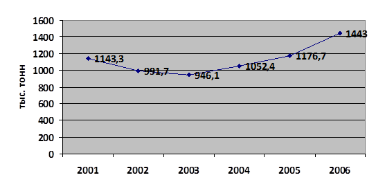 Рис. 2. Динамика объемов производства колбасных изделий за 2001- 2006 гг