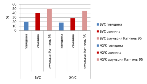 Влагоудерживающая способность (ВУС) фарша из говядины 2 сорта составляла 21,7%, жирной свинины – 49,7%, а фарша с использованием эмульсии - 54%.