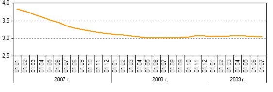 Рис. 4 Скорость обращения денег, рассчитанная по денежному агрегату М2 (В среднегодовом выражении).